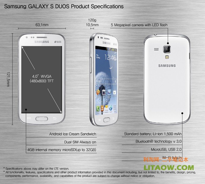 三星集團(tuán)又推出一款新款智能手機(jī),將首先在歐洲發(fā)布并推出,型號(hào)是Galaxy S Duos。這款手機(jī)早前就被媒體報(bào)告過(guò),現(xiàn)在終于得到了官方的證實(shí)并且已經(jīng)在三星的官方網(wǎng)站公布了,配置如下:處理器用的是1GHZ的核心CPU,再配上最高可達(dá)32GB的SD內(nèi)存卡,機(jī)身自帶4G存儲(chǔ),攝像頭有500萬(wàn)像素,屏幕用的是4寸的TFT屏幕,電池容量為1500毫安,3.0的藍(lán)牙配備,MICRO USB接口,系統(tǒng)預(yù)裝的是安卓4.0系統(tǒng),另外外觀如下圖所示,跟今年三星的主打的旗艦機(jī)Galaxy S III幾乎外觀一樣。官方公布的發(fā)售地區(qū),表示將首先在歐洲區(qū)發(fā)售,其它地點(diǎn)有興趣的朋友可以隨時(shí)留意三星官網(wǎng)信息。