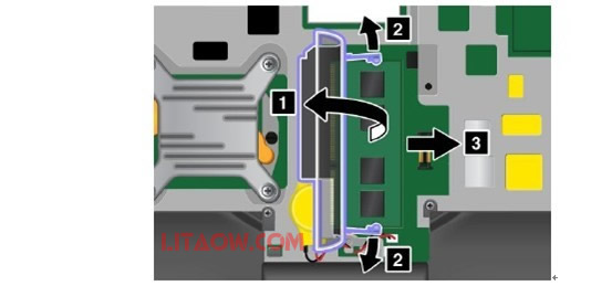 下面你就可以看到內(nèi)存位置了,內(nèi)存上首先1 掰開兩邊固定的鋼架子,然后2拔出來就可以了,內(nèi)存旁邊是預(yù)留的位置安裝3G模塊使用的