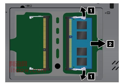 看待內(nèi)置的內(nèi)存當(dāng)然就是下面的樣子了,左右兩個槽一般來說出廠X220預(yù)裝的位置在右邊,所以我們以拆開右邊為例子先按1掰開金屬支架然后拔出內(nèi)存