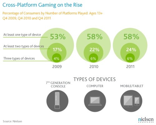 米國(guó)的一個(gè)調(diào)查公司Neilsen 近期發(fā)布了一個(gè)關(guān)于本國(guó)游戲使用的一個(gè)報(bào)告,也就是說(shuō)玩游戲在每個(gè)美國(guó)人的生活中占據(jù)了一個(gè)不錯(cuò)的覺(jué)得。相對(duì)去年來(lái)說(shuō)美國(guó)人每天花費(fèi)在游戲上的時(shí)間增加了大約是 7%(估計(jì)是蘋(píng)果ipad游戲機(jī)以及一些平板電腦的功勞);現(xiàn)在還有一些Wii、Xbox 360、PlayStation 3 等次世代游戲主機(jī)的擁有率也從 50%上升到了 56%;越來(lái)的用戶(hù)喜歡上平時(shí)上班路中玩游戲來(lái)打發(fā)時(shí)間,24%的被調(diào)查者表示自己至少在 2 個(gè)平臺(tái)(主機(jī)、PC、平板或是移動(dòng)設(shè)備)上玩過(guò)游戲,但是去年的這個(gè)調(diào)查只有 17%;單獨(dú)在移動(dòng)設(shè)備方面,iOS 在各個(gè)年齡段都有類(lèi)似數(shù)量的用戶(hù),不過(guò)安卓平臺(tái)的客戶(hù)大約都是一些24-34歲之間的用戶(hù)使用。
