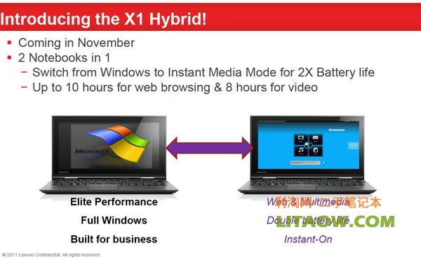 你是不是和我一樣對(duì)于thinkpad X1筆記本續(xù)航時(shí)間又疑問?現(xiàn)在看來聯(lián)想自己也對(duì)此不滿意。最新的資料顯示,不過就在這個(gè)月底聯(lián)想將發(fā)售改版的 ThinkPad X1,加入了一個(gè)新的 Instant Media Mode 即時(shí)媒體模式。聯(lián)想將其稱之為 ThinkPad X1 Hybrid 混合版,你也許能這樣來理解這個(gè)可以Windows 7 / Media Mode 兩個(gè)模式之間切換。當(dāng)你需要做一些商務(wù)應(yīng)用時(shí)候可以選擇 Windows 7 ;如果只是進(jìn)行網(wǎng)頁瀏覽和影音播放,可以切換到即時(shí)媒體模式,這個(gè)界面也是和 IdeaPad K1 一樣的四葉草風(fēng)格。當(dāng)然,后者可以帶來 8 小時(shí)的視頻播放時(shí)間和 10 小時(shí)的網(wǎng)頁瀏覽時(shí)間。 泄露出來的文件還顯示,聯(lián)想將會(huì)在明年 5 月份發(fā)布售價(jià) US$1,300 (約 8,250 元人民幣)到 US$800 (約 5,070 元人民幣)之間的 13 英寸到 14 英寸的 Ultrabook 產(chǎn)品線。除了上面說的以外12月聯(lián)想還將發(fā)布 ThinkPad x130e,也是ThinkPad X120e 的后續(xù)機(jī)型。因?yàn)槎际窍葟膰?guó)外發(fā)售暫時(shí)不清楚在國(guó)內(nèi)什么時(shí)候能看到這款筆記本!