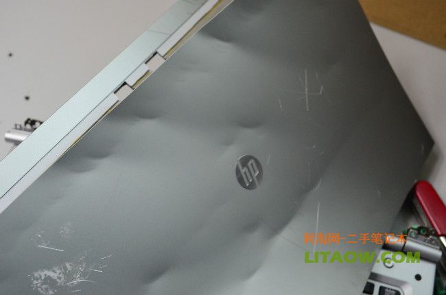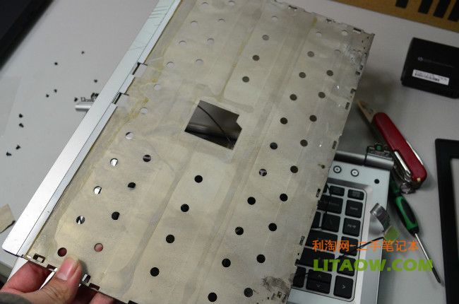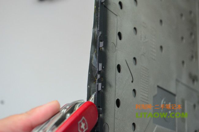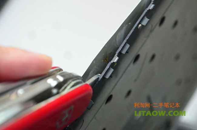拿來一個瑞士軍刀,從邊角的地方開始撬開,惠普在出廠的時候將兩個金屬外殼先做好然后使用強力橡膠貼合在一起,用軍刀都很難將其分離,最后我們連錘子都用上了!