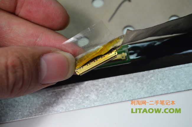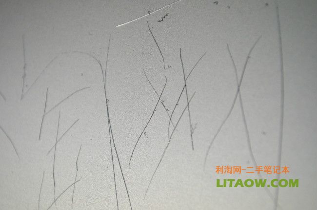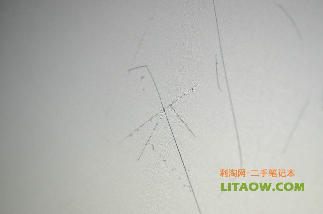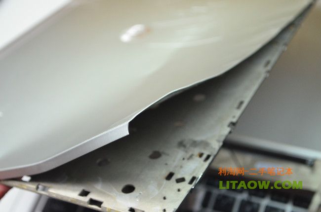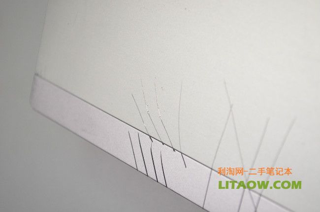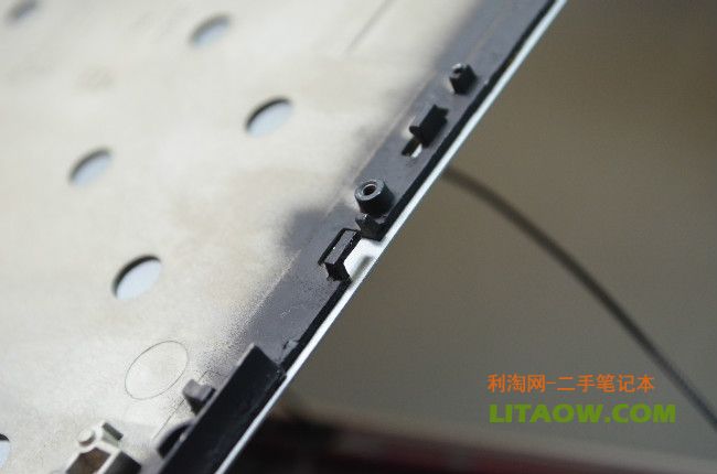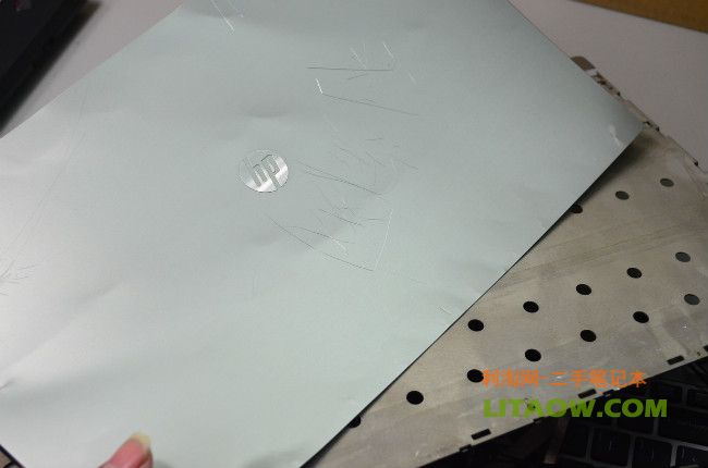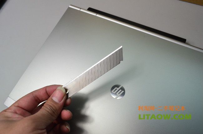 很明顯已經(jīng)可以看到了金屬面的反光,不論是Thinkpad還是HP的機型筆記本電腦的無線以及3G預留的天線位置都隱藏在屏幕外殼上,因此為了增強信號不被金屬屏蔽,Thinkpad的做法就是在外殼最上面有一塊塑料來代替金屬,而HP從NC6400開始到后來的6930P.8440P,8460P都沿用了最開始的設計,那就是將最上面的一個橫條使用塑料材質然后里面放置隱藏的天線位置,下圖中我們可以看到刀片劃過之后金屬的和塑料還是有一定的差別!