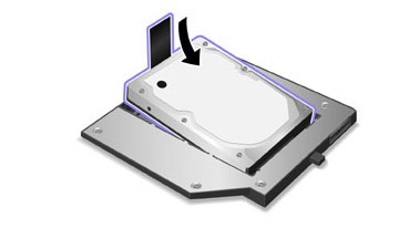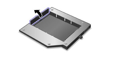 下面就是光驅(qū)位第二塊硬盤(pán)托架了,先將托架上固定硬盤(pán)的擋板翻轉(zhuǎn)過(guò)來(lái),就是如下面圖片中的操作一樣,二手T420中使用的托架稍微厚一點(diǎn)但是操作也是一樣的因此也可以看這個(gè)教程來(lái)完成!