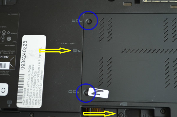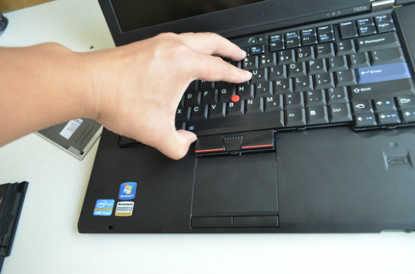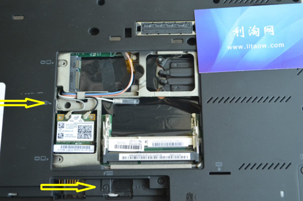 什么樣的情況下會需要拆鍵盤呢? 一般來說清理風(fēng)扇的時候而且不想徹底將風(fēng)扇拆卸下來的時候可以在這里完成,因?yàn)榭梢钥吹揭稽c(diǎn)點(diǎn)的風(fēng)扇葉子,一共只有兩個螺絲看到下面圖中有兩個藍(lán)色的圈擰開后 我們就可以看到后蓋的下面有一個固定鍵盤的螺絲另外一個我們也用箭頭標(biāo)注了起來,完成上面的動作后再將T420的屏幕打開和其他的一些IBM機(jī)型一樣將鍵盤往前推然后取出就可以了。
