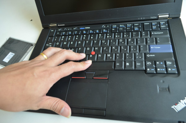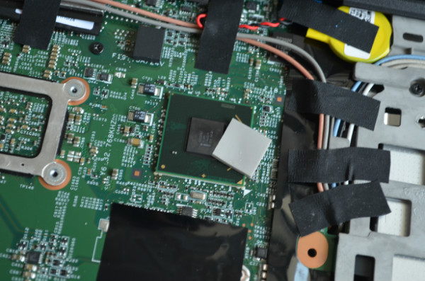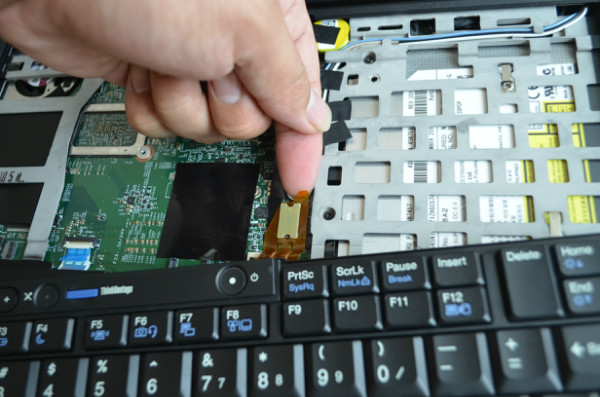 圖中應(yīng)該可以看到鍵盤的數(shù)據(jù)排線前面有一個小的塑料多出來,這里就是用來給拆排線的把手,我們拉著她就可以將它與主板分離,另外你要注意拆的時候這里有一個大的硅膠墊是幫助芯片散熱的,將芯片上的熱量導(dǎo)入到鍵盤上散熱,如果拆機(jī)后不注意的話會導(dǎo)致T420S的運(yùn)行部穩(wěn)定特別是溫度高的情況下。
