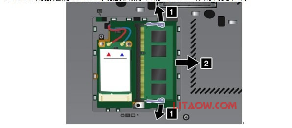 下面你就可以看到內存位置了,內存上首先1 掰開兩邊固定的鋼架子,然后2拔出來就可以了,內存旁邊是預留的位置安裝3G模塊使用的