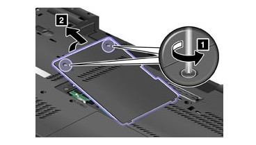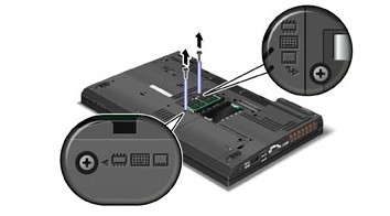 首先將自己的T510或W510的電源拔掉然后電池取下來,如果能做到的話最好拆之前洗手這個主要是放掉靜電,然后如下圖中可以看到后蓋的兩顆螺絲固定的,按照圖中的箭頭方向擰開螺絲后如下圖取出后蓋,其中這個系列的內(nèi)存也安裝在這個位置,如果需要更換內(nèi)存或者升級的話也是在這里操作。