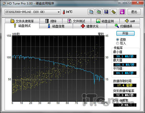 最后來看一下,有關(guān)于HD Tune硬盤的測試,ThinkPad X220 Tablet配備的是一塊320GB的硬盤,存儲空間只能算是中規(guī)中矩。在通過測試,我們看到這款ThinkPad X220 Tablet最大讀取速度105.8MB/秒,平均讀取速度84.1MB/秒,測試的整個過程,走勢都是非常的穩(wěn)定,并且在測試過程中的硬盤溫度為 34°C,非常的出色和理想。