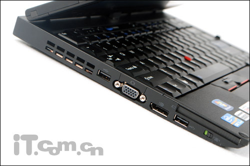 在機(jī)身左側(cè),ThinkPad X220 Tablet為用戶提供了一個USB2.0接口、VGA接口、HDMI接口、1個USB2.0接口、無線控制開關(guān)鍵以及Display 接口。