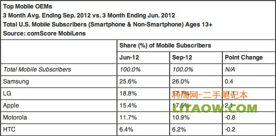 全球性互聯(lián)網信息服務提供商ComScore發(fā)布最新全球手機系統(tǒng)平臺占有率,其中上升幅度最大的是蘋果的iOS系統(tǒng)。ComScore是在最近一個季度間遍訪了美國超過3萬名智能手機使用的用戶,以此來為基準分析得出現(xiàn)在全球市場手機的市占有率,其中在智能手機平臺占有率方面,谷歌依然勞勞的把持住手機系統(tǒng)市場上的龍頭老大位置,市占有率高達百分之五十二點五,超過一半的占有率,但上升幅度最大的還算是蘋果的IOS系統(tǒng),上升了百分之二左右,以百分之三十四點三的市場占有率位居第二位,其它依次是黑莓系統(tǒng),微軟的windows系統(tǒng)還諾基亞的塞班系統(tǒng)。其中降幅最多的是黑莓系統(tǒng)??磥砉雀韬吞O果已經不是其它系統(tǒng)能陰檔的了的了。