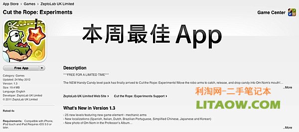 蘋果最近越來(lái)越多的對(duì)其APP應(yīng)用高店進(jìn)行改革,諸如編編輯精選,精品推薦,最佳排名,下載最多,熱門介紹及新品推薦等諸多方式,力圖給全球用戶尋找到更多精品應(yīng)用并帶來(lái)更多種的方式體驗(yàn)APP應(yīng)用商店,給應(yīng)用商及用戶帶來(lái)諸多便利。今日蘋果在國(guó)外推客上,宣布新增一個(gè)應(yīng)用分類“本周最佳APP”,并提供免費(fèi)下載,這周的最佳是切害繩子游戲,不知道大家玩沒(méi)有,沒(méi)有玩過(guò)的現(xiàn)在快去應(yīng)用商店免費(fèi)下載吧,機(jī)會(huì)難得哦。