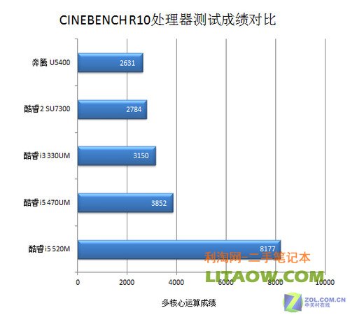 為了幫助大家了解其性能定位,我們列出之前評測的過的一些數(shù)據(jù):奔騰雙核U5400雙核成績?yōu)?631 CB-CPU,酷睿2雙核SU7300雙核成績?yōu)?784 CB-CPU,酷睿i3 330UM雙核成績?yōu)?150 CB-CPU,酷睿i5 520M雙核成績?yōu)?177 CB-CPU,如圖所示。