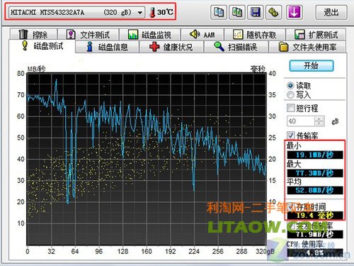 聯(lián)想U(xiǎn)260配備了一塊日立320GB筆記本硬盤,經(jīng)過HD Tune測試,其最大讀取速率為77.3MB/s,平均速率為52.8MB/s,存取響應(yīng)時(shí)間為19.4ms,在5400轉(zhuǎn)同類硬盤中表現(xiàn)中規(guī)中矩。