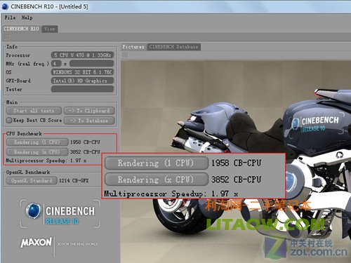 CINEBENCH R10處理器渲染測試過程中,單核心處理速度并不算快,成績?yōu)?958 CB-CPU,雙核心四線程速度明顯加快,成績?yōu)?852 CB-CPU。