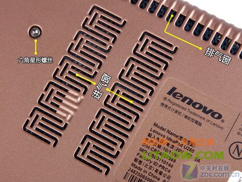 由于使用了內(nèi)置電池,機(jī)身底部比較平坦,僅設(shè)計(jì)有我們熟悉的古典風(fēng)格散熱窗,空氣由底部進(jìn)入機(jī)身,內(nèi)部循環(huán)后由后端的排氣窗出來,另外六角螺絲比較特別,這種型號的螺絲在筆記本上比較少見,由于沒有硬件擴(kuò)展倉,因此日后想要升級配置或清理風(fēng)扇并不輕松。