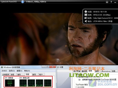 打開Power DVD播放軟件,首先進(jìn)入視頻界面,啟用硬件加速功能,通過Intel Clear Video技術(shù),實(shí)現(xiàn)完全硬解MPEG2、VC-1以及H.264這些主流編碼格式的高清影片,可以看到在視頻播放過程中處理器占用率是很低的,也就是說還有很大余量去處理其它的事情。