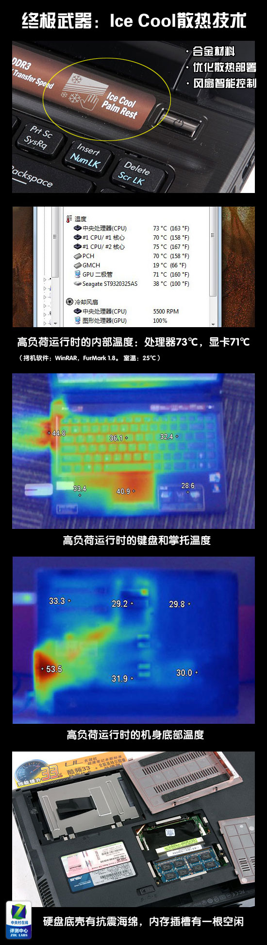 一款筆記本,無論性能有多好、續(xù)航時(shí)間有多長(zhǎng),如果散熱效果不好也是無法令人滿意的。在華碩UL80Jt的機(jī)身貼標(biāo)中,我們看到“Ice Cool Palm Rest”(清涼掌托)的字樣,看來它對(duì)自己的散熱效果還是有信心的。下面我們就通過實(shí)際測(cè)試,來看看它的內(nèi)部和表面溫度究竟如何?