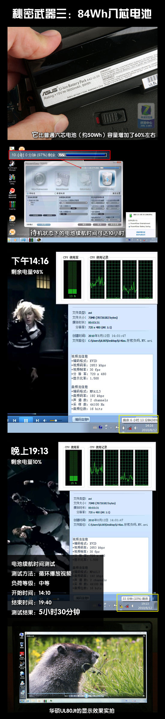 那么,當(dāng)超省電的處理器和顯卡配上大容量電池后,UL80Jt可以持續(xù)工作多長(zhǎng)時(shí)間呢?在下面的截圖中,我們看到這款本本在低負(fù)荷的待機(jī)狀態(tài)下可以續(xù)航10小時(shí)左右,但很明顯這個(gè)數(shù)據(jù)并沒有太大意義,我們想知道的是筆記本在不間斷的正常使用下,實(shí)際能工作多少小時(shí)?