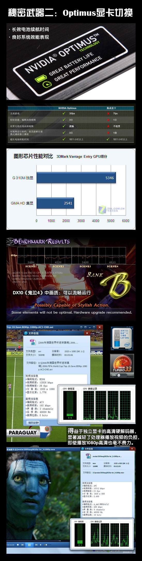 從上面的測(cè)試成績(jī)來看,G 310M獨(dú)顯的性能大約是集顯的兩倍左右,玩普通游戲、看高清電影都沒有任何問題。如果說Turbo33解決了CPU方面的性能瓶頸,那么Optimus就解決了顯卡方面的性能瓶頸,同時(shí)在電池續(xù)航時(shí)間方面也沒有任何妥協(xié)。